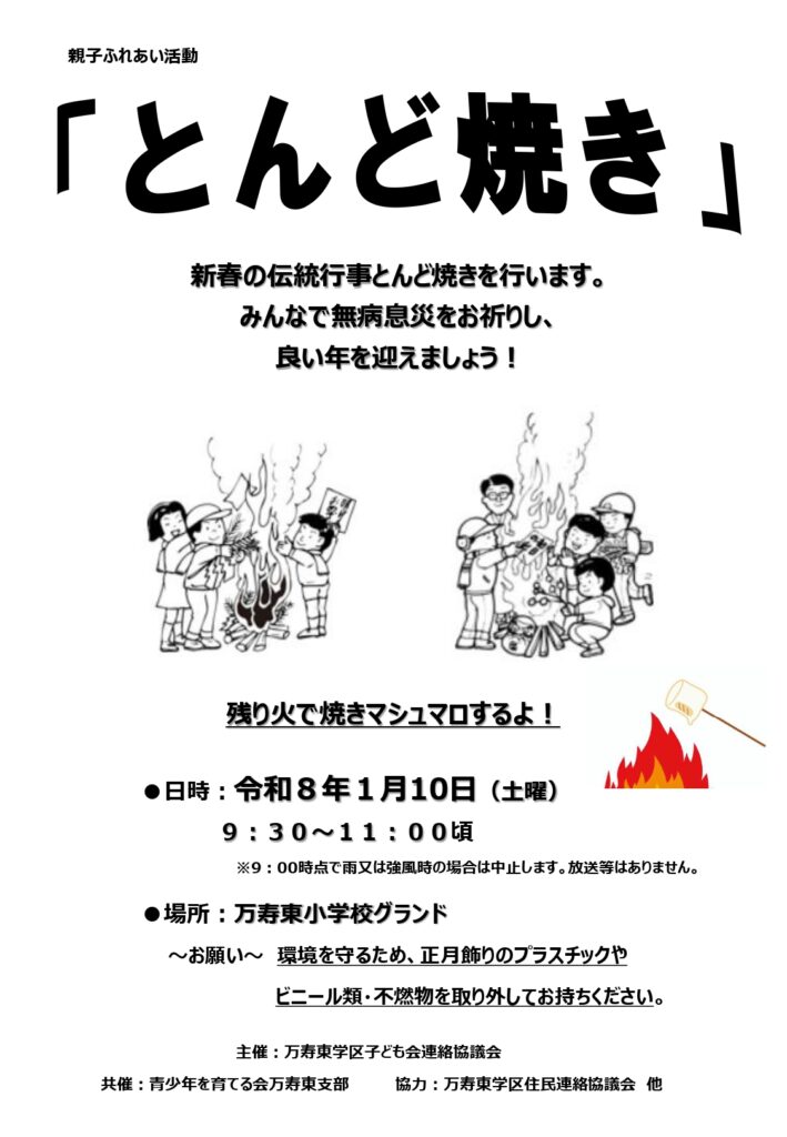 「とんど焼き」開 催のご案内 2025 12/25 イベント お知らせ こども会 2025年12月25日 日時 令和8年1月10日(土曜日) 9:30〜11:00頃 場所 万寿東小学校グランド イベント お知らせ こども会 よかったらシェアしてね! URLをコピーしました! URLをコピーしました! 倉敷市防災危機管理センタ−ができました。 令和8年1月 休日当番医のお知らせ この記事を書いた人 masujyuminkyou 関連記事 万寿東学区住民連絡協議会より防災訓練のお知らせ 2026年2月1日 2月の休日当番医のお知らせ 2026年2月1日 令和8年1月 休日当番医のお知らせ 2025年12月29日 倉敷市防災危機管理センタ−ができました。 2025年11月27日 12月の休日当番医カレンダー 2025年11月25日 倉敷市立万寿東幼稚園の運動会に行きました。 2025年10月13日 10月の休日当番医カレンダ- 2025年10月10日 万寿東学区 ミニミニ健康展をしました。 2025年10月9日 コメント コメントする コメントをキャンセルコメント ※ 名前 ※ メール ※ サイト 次回のコメントで使用するためブラウザーに自分の名前、メールアドレス、サイトを保存する。 上に表示された文字を入力してください。
