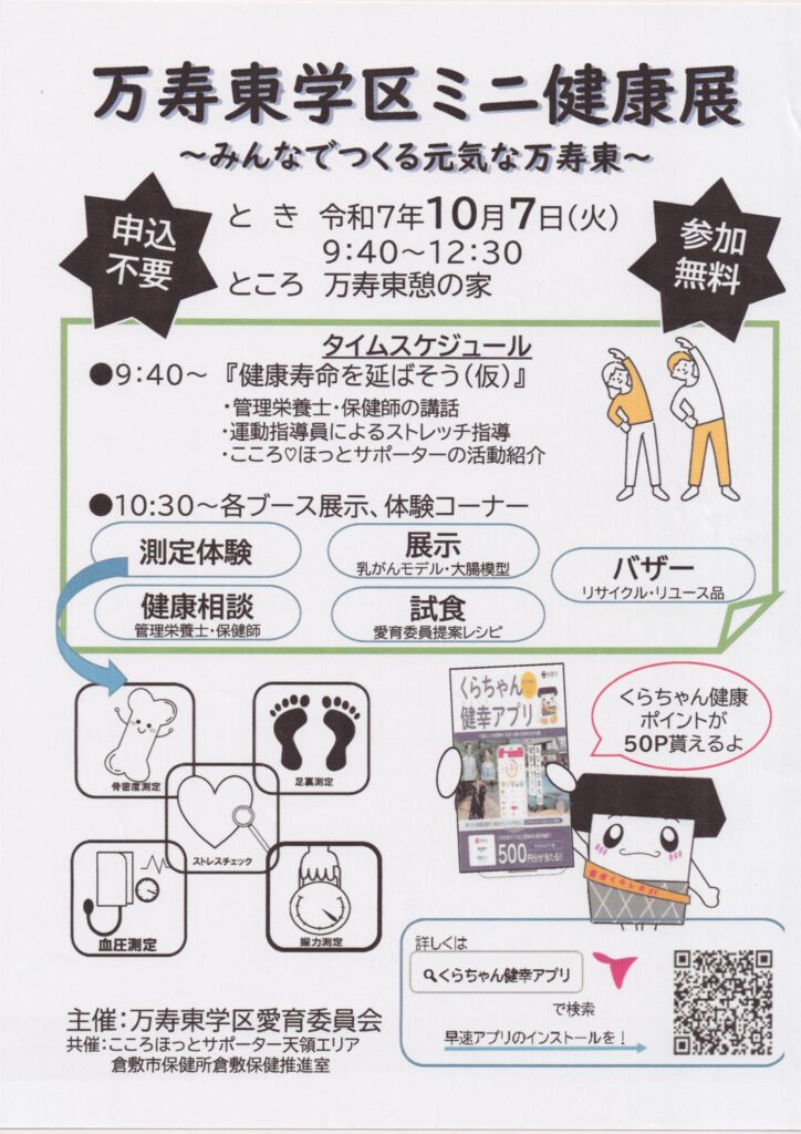 万寿東学区ミニ健康展の実施します。 2025 9/11 イベント お知らせ 部会 愛育員会 愛育委員 2025年9月11日 みんなでつくろる元気な万寿東・・・申込不要・参加無料 とき 令和7年10月7日 (火曜日) 9時40分〜12時30分 ところ 万寿東憩の家 🔵 10時30分〜各ブ−ス展示、体験コ−ナ−あります。 ※主催 万寿東学区愛委員会 イベント お知らせ 部会 愛育員会 愛育委員 よかったらシェアしてね! URLをコピーしました! URLをコピーしました! 令和7年度 万寿東学区 夏祭り開催しました。 第一回万寿東学区合同 文化展開催の案内 この記事を書いた人 masujyuminkyou 関連記事 万寿東学区住民連絡協議会より防災訓練のお知らせ 2026年2月1日 2月の休日当番医のお知らせ 2026年2月1日 令和8年1月 休日当番医のお知らせ 2025年12月29日 「とんど焼き」開 催のご案内 2025年12月25日 倉敷市防災危機管理センタ−ができました。 2025年11月27日 12月の休日当番医カレンダー 2025年11月25日 倉敷市立万寿東幼稚園の運動会に行きました。 2025年10月13日 10月の休日当番医カレンダ- 2025年10月10日 コメント コメントする コメントをキャンセルコメント ※ 名前 ※ メール ※ サイト 次回のコメントで使用するためブラウザーに自分の名前、メールアドレス、サイトを保存する。 上に表示された文字を入力してください。
