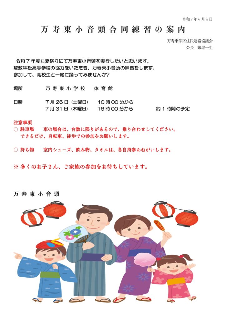 令和7 年度も夏祭りにて万寿東小音頭を実行したいと思います。 倉敷翠松高等学校の協力をいただき、万寿東小音頭の練習をします。 参加して、高校生と一緒に踊ってみませんか?