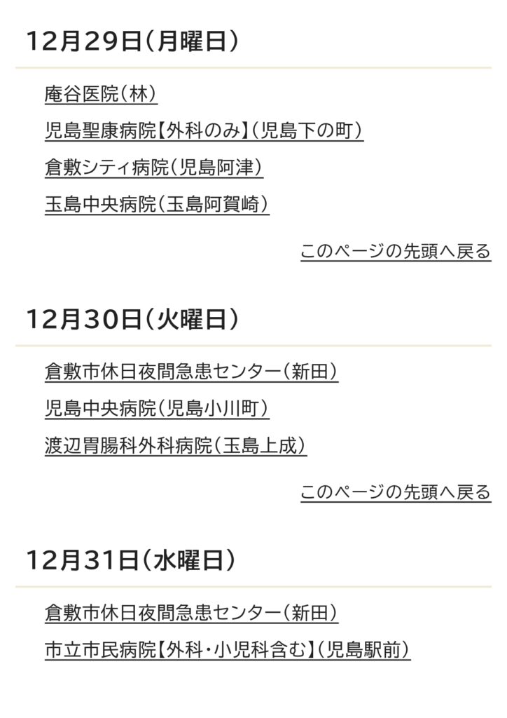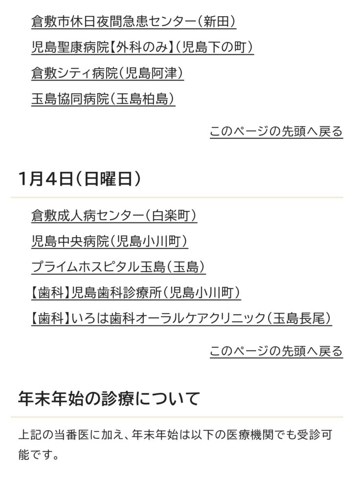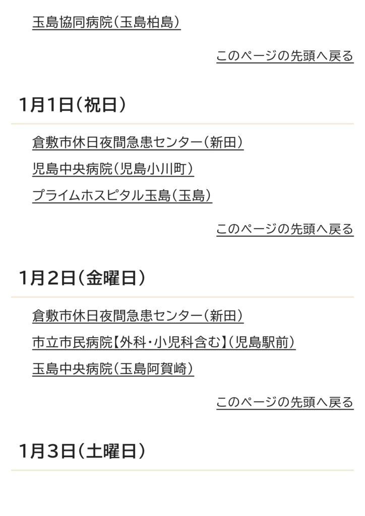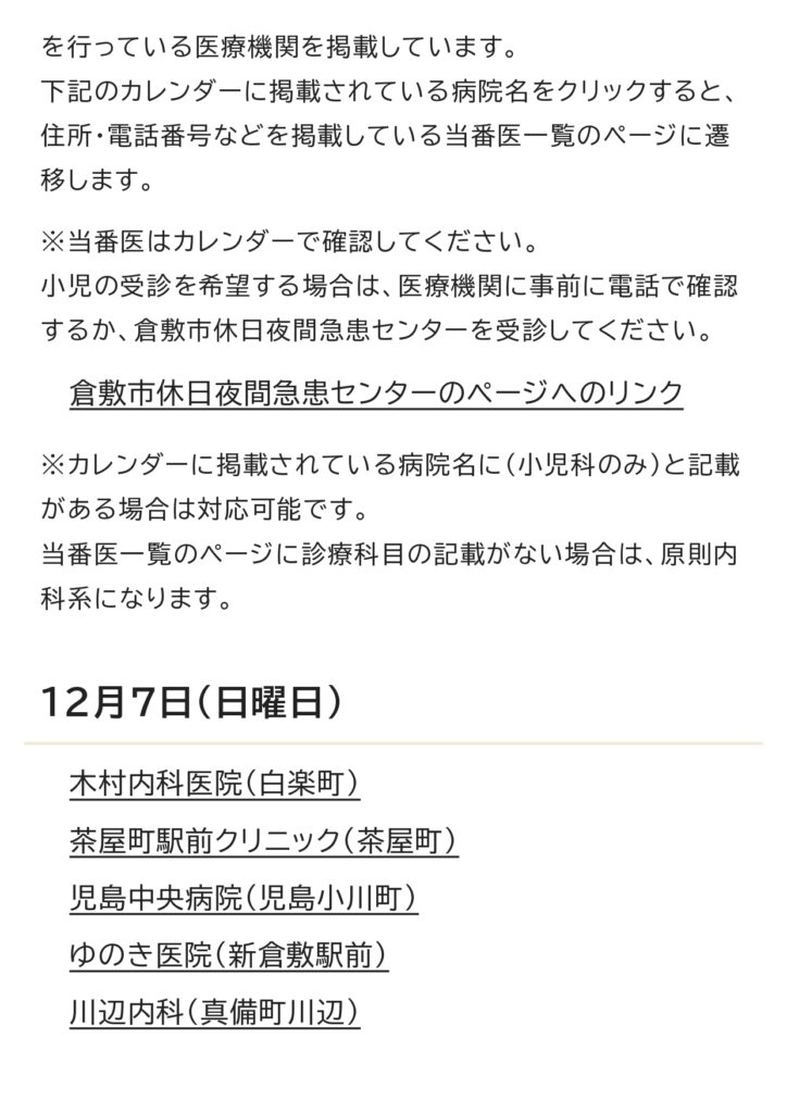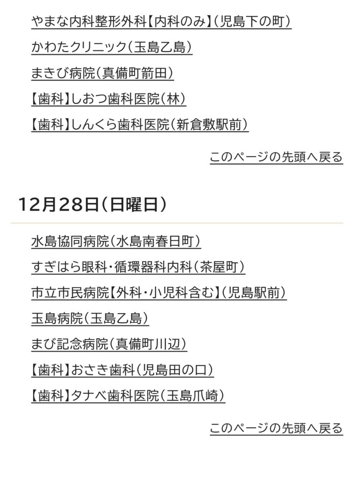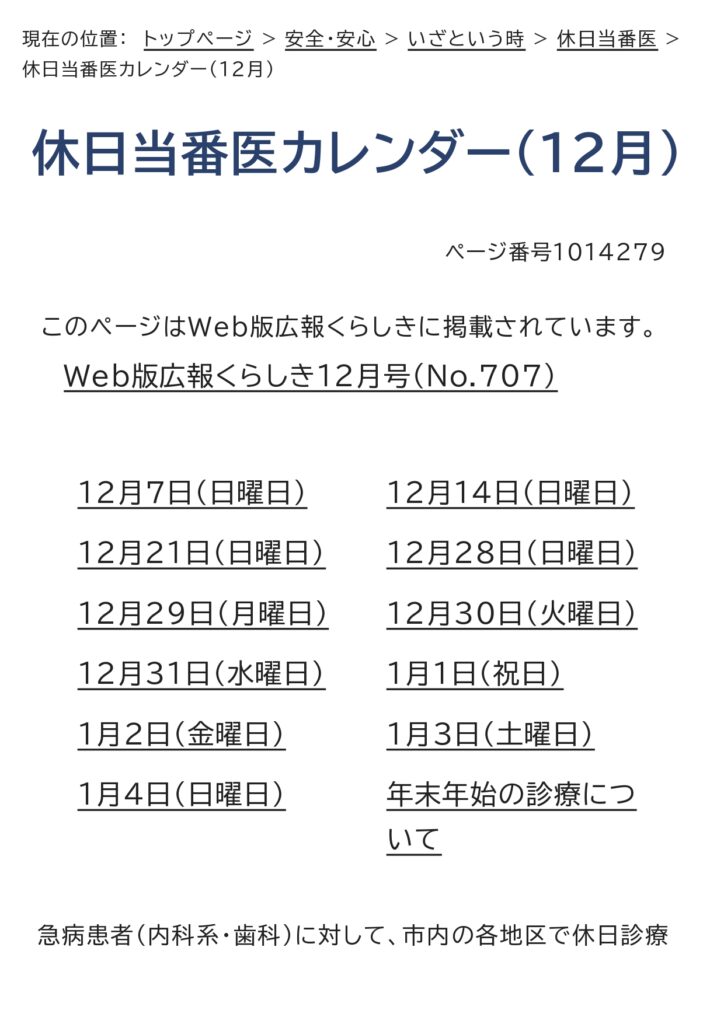 12月の休日当番医カレンダー 2025 11/25 お知らせ 2025年11月25日 お知らせ 万寿東学区住民連絡協議会 休日当番医 よかったらシェアしてね! URLをコピーしました! URLをコピーしました! 倉敷市立万寿東幼稚園の運動会に行きました。 倉敷市防災危機管理センタ−ができました。 この記事を書いた人 masujyuminkyou 関連記事 万寿東学区住民連絡協議会より防災訓練のお知らせ 2026年2月1日 2月の休日当番医のお知らせ 2026年2月1日 令和8年1月 休日当番医のお知らせ 2025年12月29日 「とんど焼き」開 催のご案内 2025年12月25日 倉敷市防災危機管理センタ−ができました。 2025年11月27日 倉敷市立万寿東幼稚園の運動会に行きました。 2025年10月13日 10月の休日当番医カレンダ- 2025年10月10日 万寿東学区 ミニミニ健康展をしました。 2025年10月9日 コメント コメントする コメントをキャンセルコメント ※ 名前 ※ メール ※ サイト 次回のコメントで使用するためブラウザーに自分の名前、メールアドレス、サイトを保存する。 上に表示された文字を入力してください。