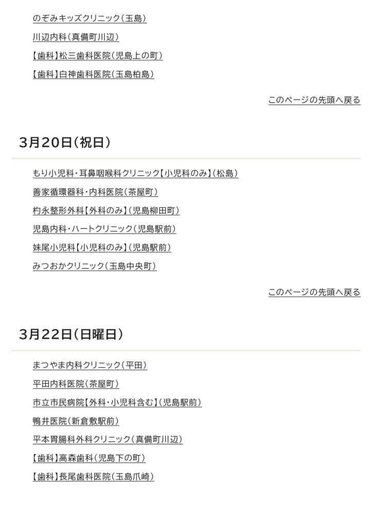 3月の休日当番医カレンダー 2026 2/23 お知らせ 2026年2月23日 お知らせ よかったらシェアしてね! URLをコピーしました! URLをコピーしました! 万寿東学区住民連絡協議会より防災訓練のお知らせ 令和7年 度防災訓練 実施しました。 この記事を書いた人 masujyuminkyou 関連記事 令和7年 度防災訓練 実施しました。 2026年2月23日 万寿東学区住民連絡協議会より防災訓練のお知らせ 2026年2月1日 2月の休日当番医のお知らせ 2026年2月1日 令和8年1月 休日当番医のお知らせ 2025年12月29日 「とんど焼き」開 催のご案内 2025年12月25日 倉敷市防災危機管理センタ−ができました。 2025年11月27日 12月の休日当番医カレンダー 2025年11月25日 倉敷市立万寿東幼稚園の運動会に行きました。 2025年10月13日 コメント コメントする コメントをキャンセルコメント ※ 名前 ※ メール ※ サイト 次回のコメントで使用するためブラウザーに自分の名前、メールアドレス、サイトを保存する。 上に表示された文字を入力してください。
